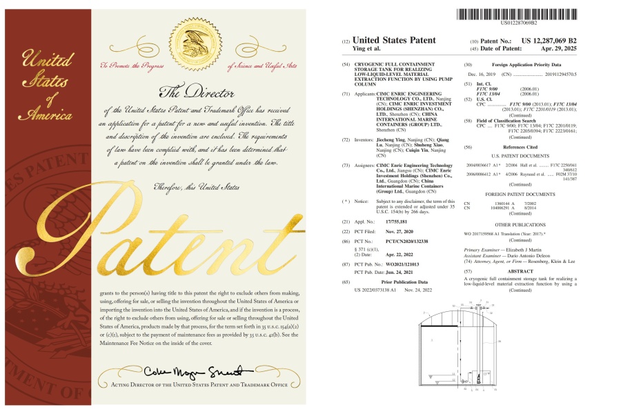 近日,中集工程科技“一种利用泵柱实现低液位物料抽提功能的低温全容罐”荣获美国专利授权。此项技术标志着低温储罐领域的一项重大突破,将现有低温全容罐中泵柱无法直接抽提的低液位物料,以生产规模的流量抽提出来...